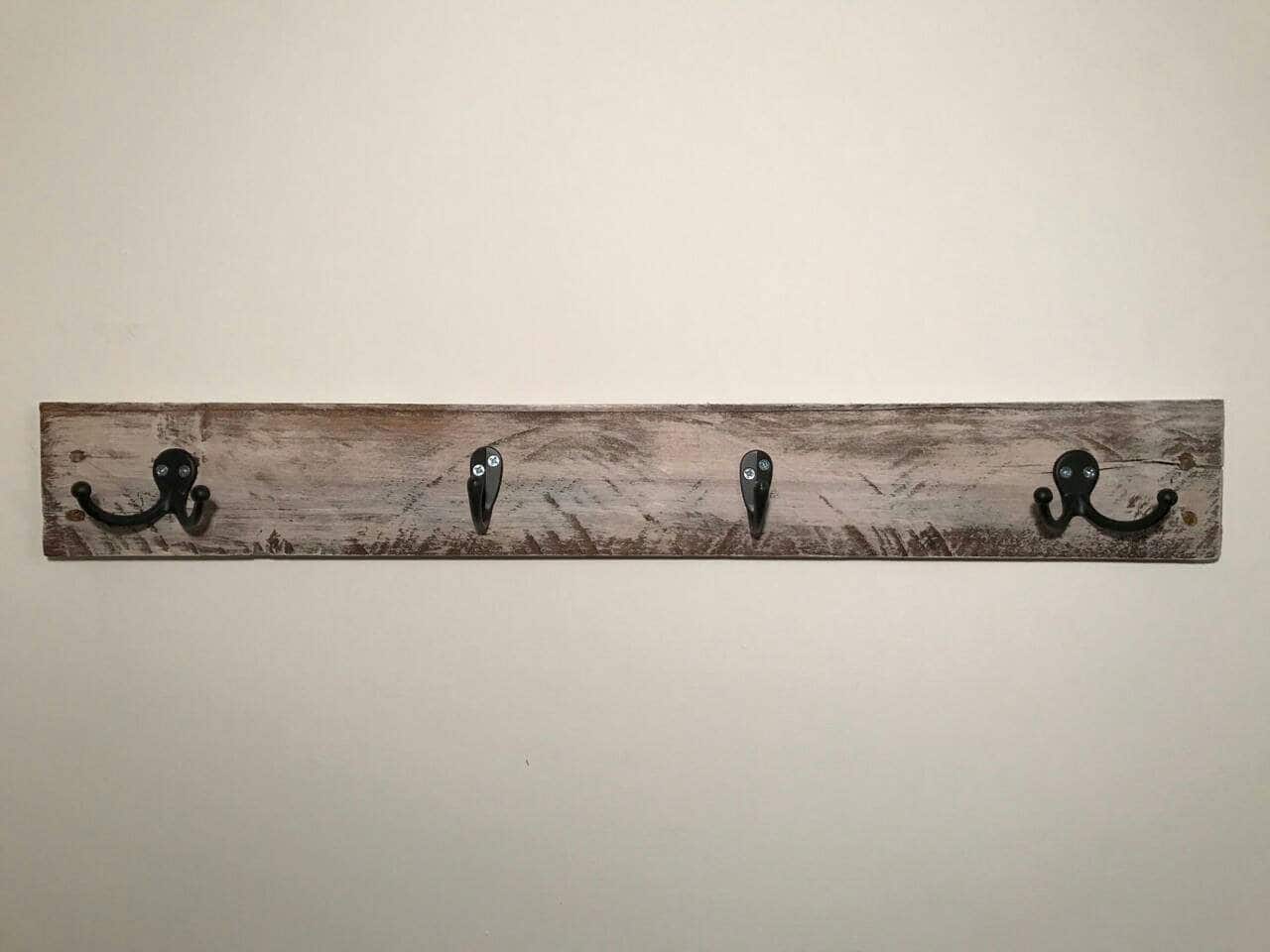 Rustic wooden sign used as a headboard, with rope spelling 'Love' and black hooks above.