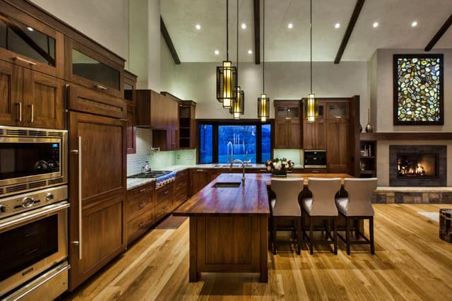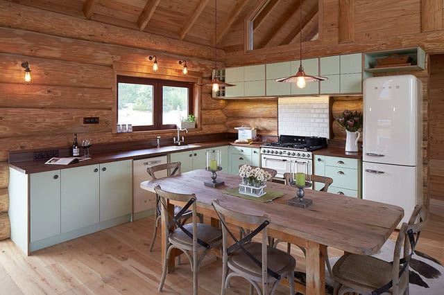 The rustic kitchen interior design is a different story than most other kitchens. There are a couple of reasons for them being quite spacious and mostly made out of wood with natural wood texture. The reasons are quite simple and obvious. Most rustic residences are constructed on mountains, lakes or in the countryside where space isn’t really a problem. This results in them being quite spacious, while the natural environment such as the forests are the reason behind the wood construction and design of the entire residences. That’s why they’re called rustic anyways.