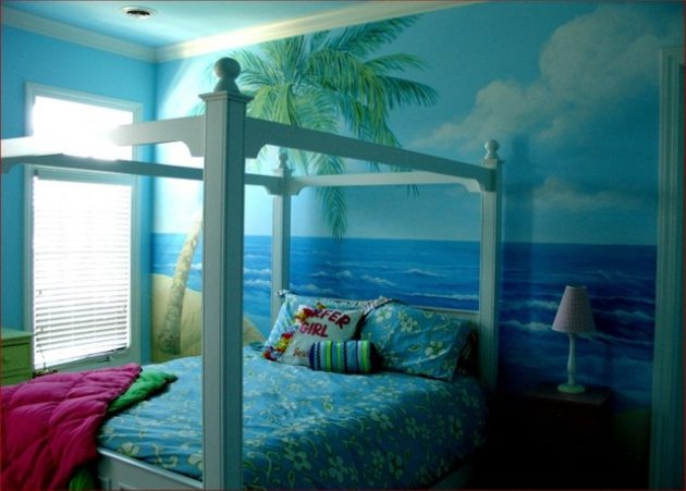 Specifying how much space you have is the very first thing that you need to do when planning a child’s room, and after that you can choose the right colors, furniture and decorations for children. If your child is of a creative kind, you can afford plenty of items and patterns that will make it feel special. Palms, ships, boats, bamboo, wave boards, monkeys, flowers, sea creatures and other accents would fit great in children’s rooms in a tropical style. The colors of the sea, sand, green, is the preferred solution in the selection of the design.