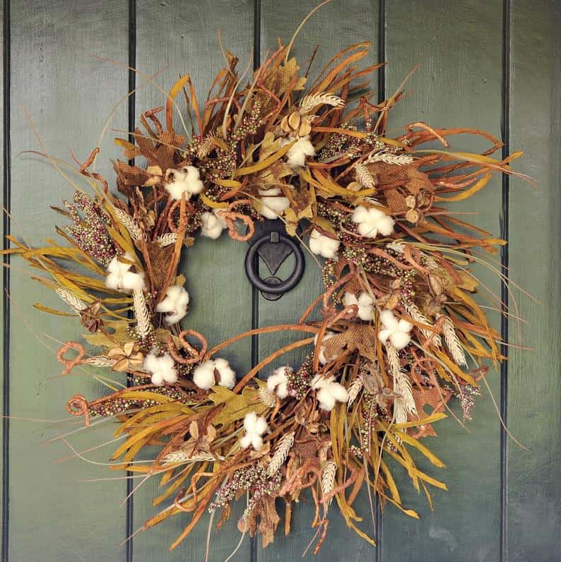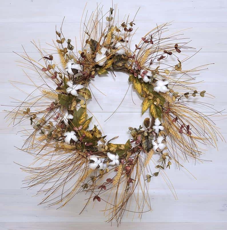 10. Rustic Fall Foliage Cotton and Pine Wreath