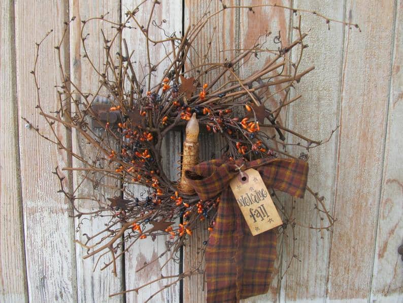 13. Primitive Fall Autumn Wreath with Pip Berry on Twiggy Grapevine Base