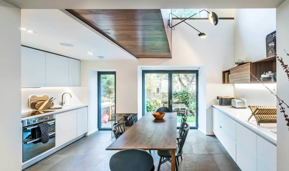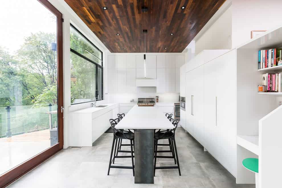 3. Kitchen with Quartz countertops, concrete flooring & walnut ceiling