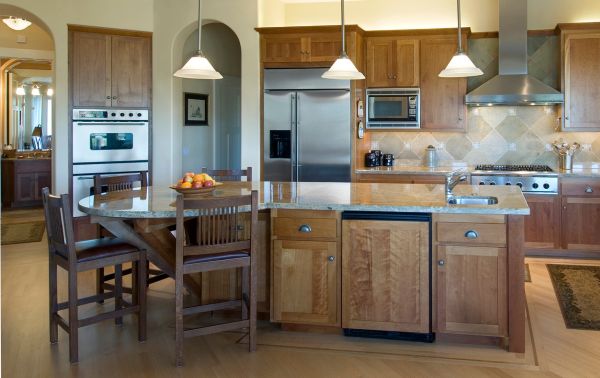 Functional lighting means bright light directly above the work surface, sink and electrical devices. In some kitchens to the underside of the upper elements can be added lined LED-lights, while the other in cupboards can be build halogen lamps. There are cabinets with lamps that are placed above the desk. If you have no possibility to replace the kitchen cabinets, there is a large selection of lamps that snakes through the system on rails, with adjustable lighting. In our collection we present you some beautiful examples of cool pendant kitchen lighting, which surely will amaze you. Enjoy!