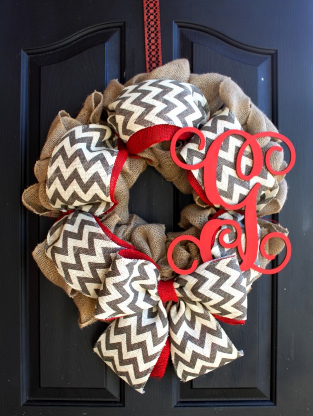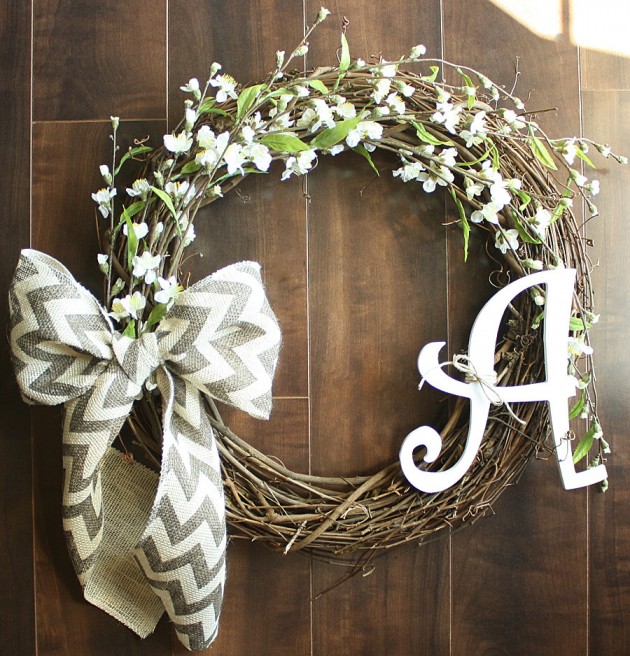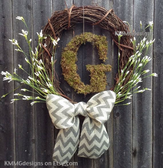 Monogrammed Grapevine Wreath with white flower details intertwined & a Chevron Bow