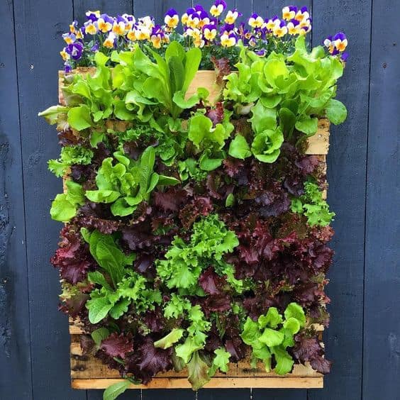Grow your own salad garden vertically with this rich mix of leafy greens and edible blooms in a pallet wall.