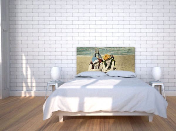 Minimalist white bedroom featuring a custom printed photo headboard with beach imagery.