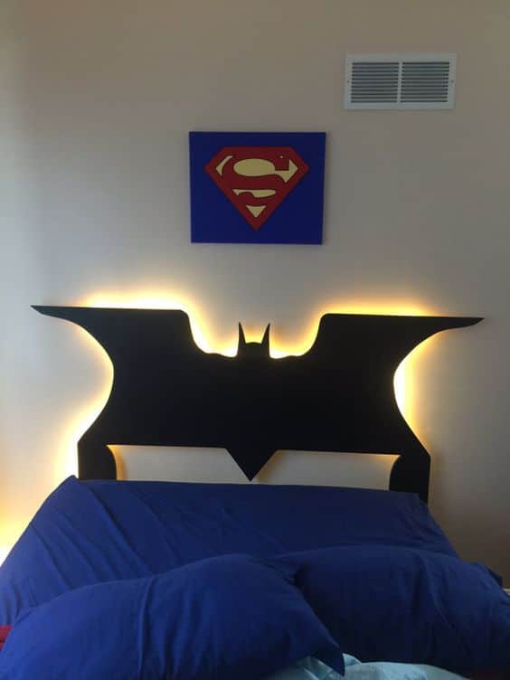 Black Batman-shaped headboard with backlit glow under Superman wall art