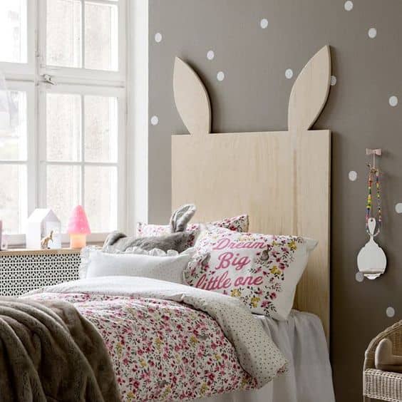 Minimal wooden headboard with bunny ears in a pastel girls' room