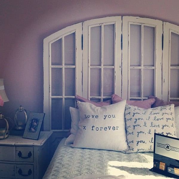 Romantic bedroom setup with a repurposed window frame as a headboard and pillows with handwritten love messages.