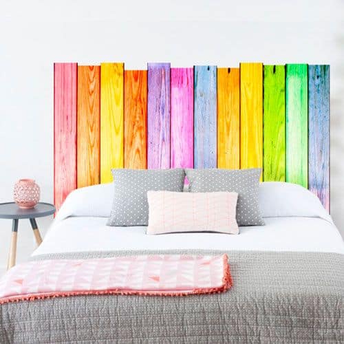 Vibrant teen bedroom with a DIY wooden headboard painted in rainbow colors against a crisp white wall.