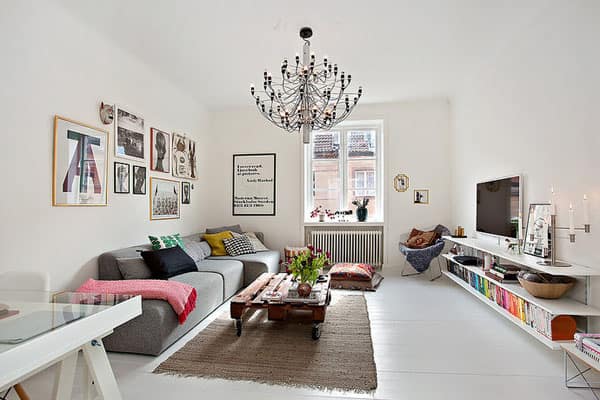 The main palette of Scandinavian decor is very bright and simple, and usually involves white with shades of light gray and blue, or pastel colors. In some interiors can be noticed also details in intense colors. Generally, all Scandinavian interiors include clean lines, and each part of interior is very functional. When it comes for materials, there is always a lot of wood in the decor. It is used on the walls, the floors, the furniture, etc … Wood gives warmth and texture to the room, and that’s why Scandinavian interiors are so pleasant and inviting. Something that can often be seen in the Scandinavian homes is a traditional fireplace, nestled in the corner of the room. These are the main characteristics of the Scandinavian style which might help you if you opt to decorate your home in this style. Below we present you some beautiful Scandinavian living rooms that will inspire you and will make you to fall in love with Scandinavian style!