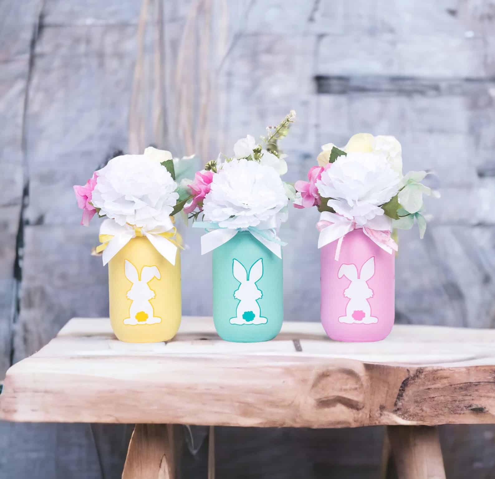 DIY Pastel Easter Mason Jar Vases With White Bunny Cutouts and Spring Flowers