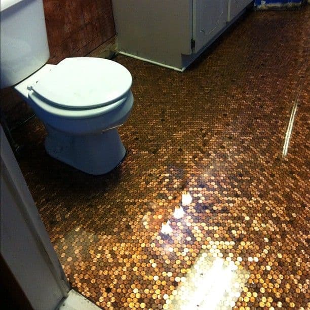 Save a little money by doing these diy projects. Instead of keeping your saved pennies in a jar you can keep saving it in very interesting places. For example you can make awesome and cool floor with pennies. You just have to glue them on the floor and it will look amazing. Also you can decorate different stuff like picture frames or you can turn your simple and boring vase into a lovely penny vase. Put some pennies on your old coffee table and make it look sophisticated. There are a lot of ways how to save your money, but this is the coolest. We present you 20 ideas how to use your saved pennies by making interesting craft interventions. Enjoy…