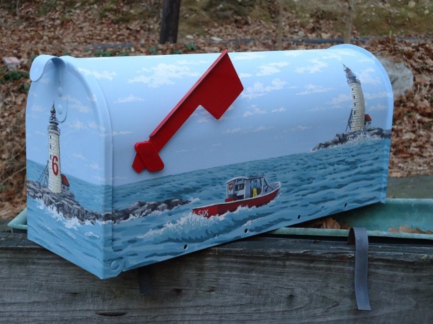 Hand Painted Maine Lobster boat and Lighthouse Mailbox