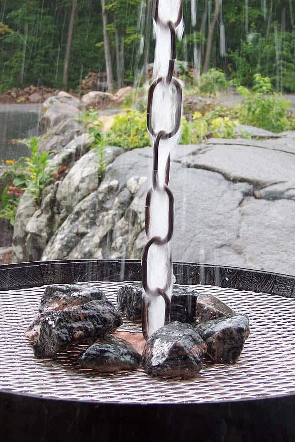 A sturdy metal chain channels intense rain into a large basin, creating a striking water feature.
