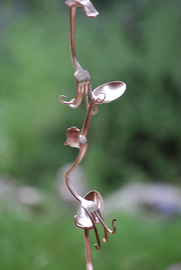 Weathered spoons are repurposed into a functional and artistic rainwater chain.