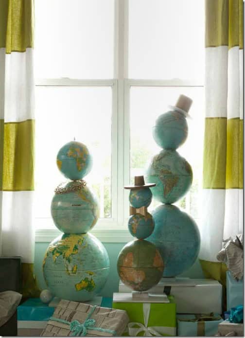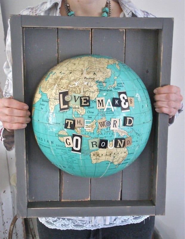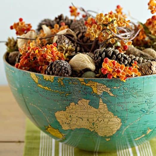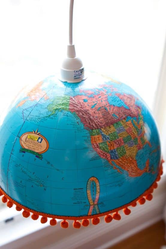 If you have old globe that is no more useful or you are just bored with the one you have, start with the creative process. There are awesome ideas that you can do it yourself and make something new for your home. You can make lamp shades from globe, just cut it in half and there you go. Make lamp shades for hanging lamp or for lamp table. It will look so chic and fun. Also you can make globe bowl to put dry flowers or other things in your home. Globes as a décor can be put in kids room where they can have great working atmosphere. We present you 20 creative diy repurposed globe ideas that will inspire you. Enjoy…