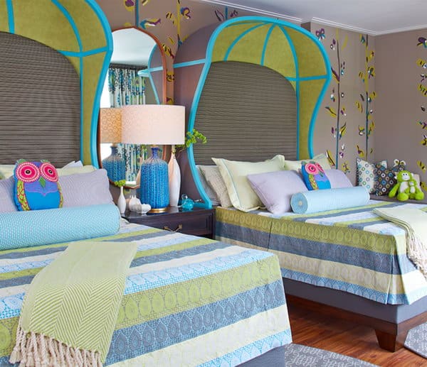 If your twins are a different sex, wardrobe simply can be separated on the both sides, or you can set additional two small closets. Of course that twins should have different identities, however, if they share a room, it is important that these identities stylish to complement. For those of different sex, choose a neutral base and add accents in matched shades, for example. You can opt for cribs in the same color, but different pink and blue bedding, for example, and carpet that will look neutral, perhaps the white-gray stripes. Here we present you most graphically example, but do not be afraid to experiment with colors. For children colorful and serene, is always a winning combination. In any case, if you comply with this rule, will avoid the effect of being in a room pushed two different interiors. If you have twins of the same sex, and you want to decorate their room with two identical beds, see our collection below, and you will find many inspirational examples how to do that!