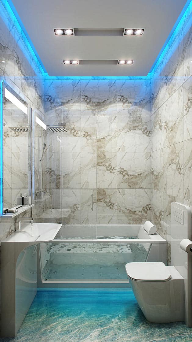 In terms of creativity, the bathroom is the most interesting part of the arrangement, where you can let your imagination run wild and create an atmosphere of what suits you the best. Do not forget that the positioning of the sanitary part, affects the position of doors and windows, and if the bathroom is so small and you can not find room for radiators, you need to consider the floor heating.