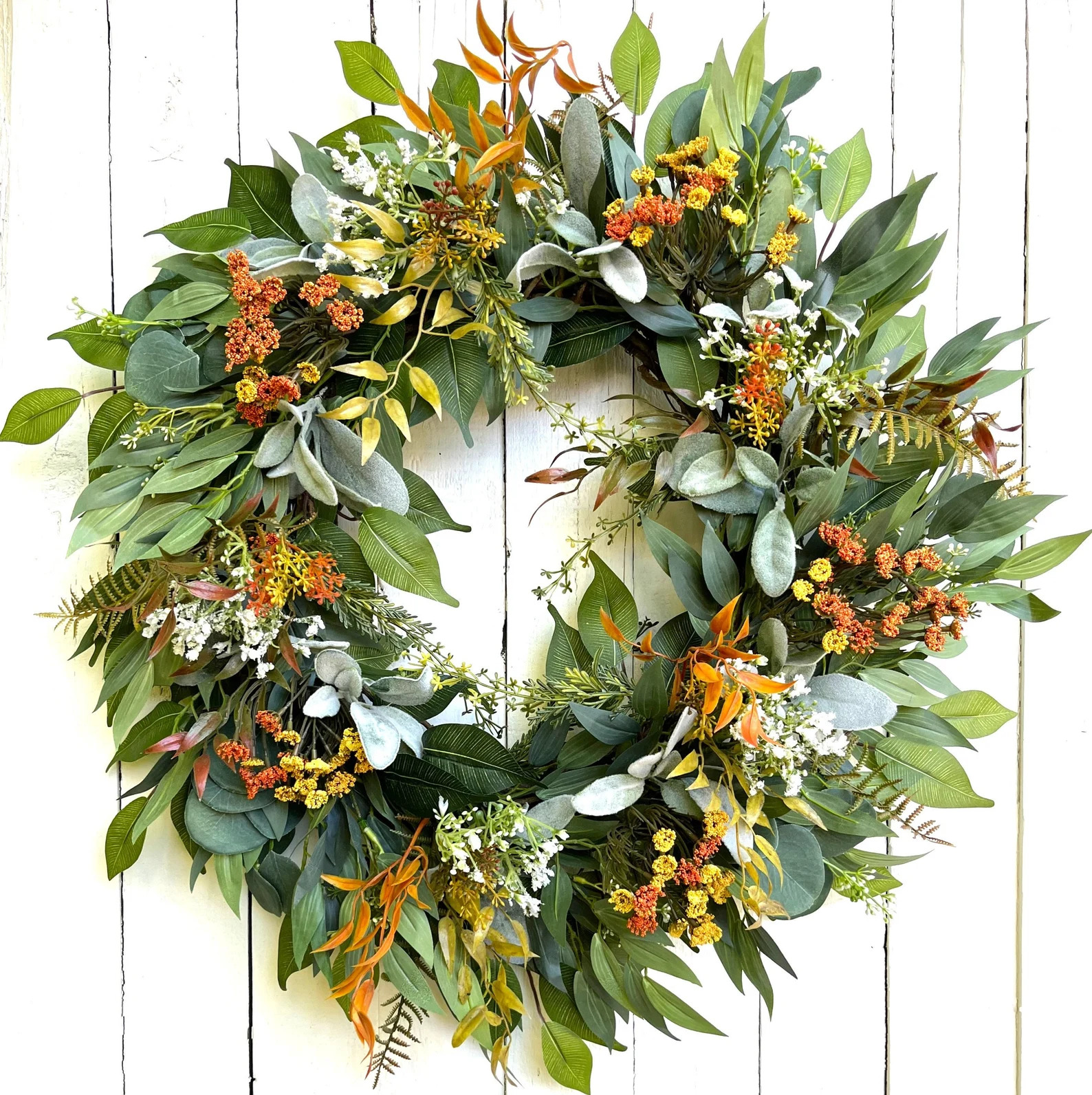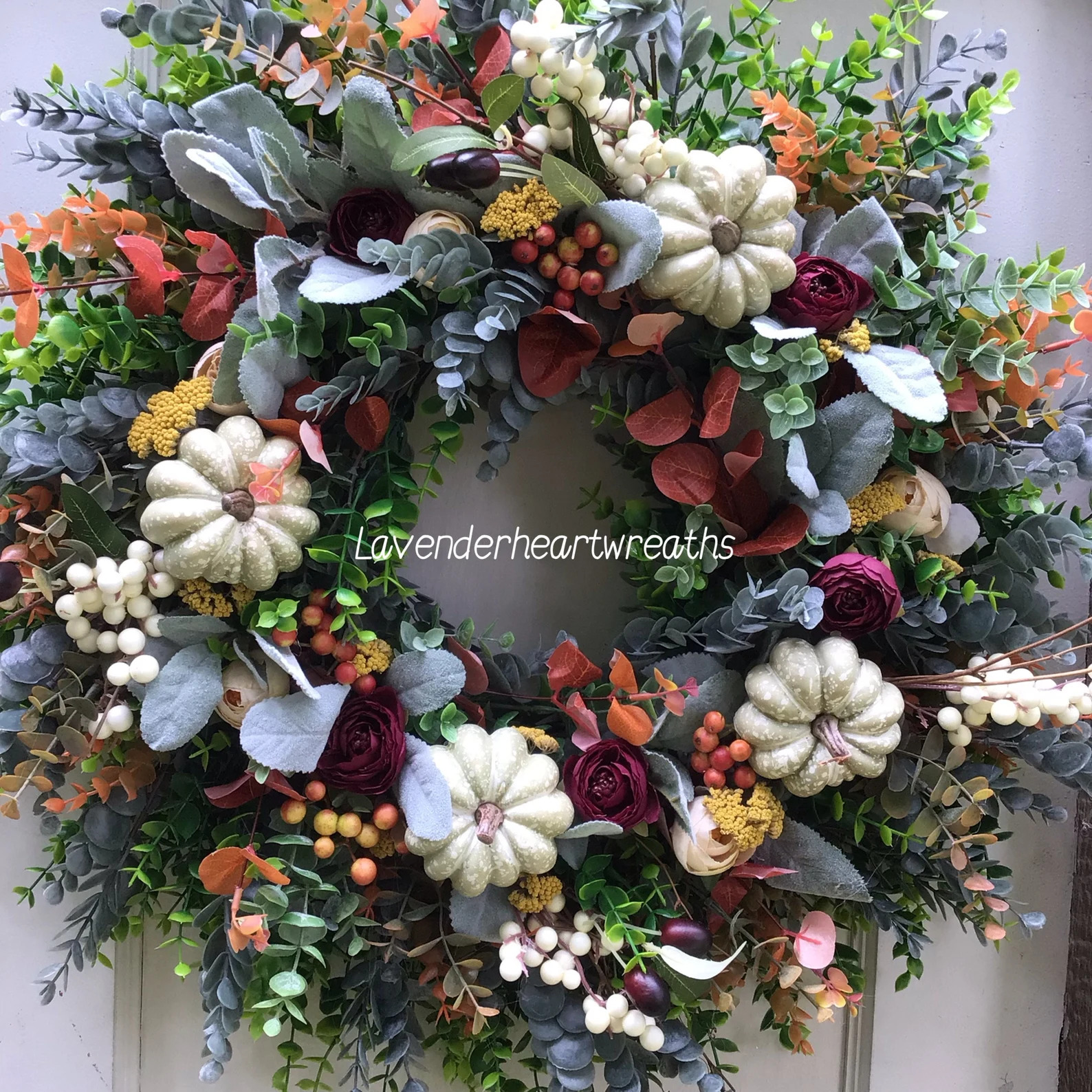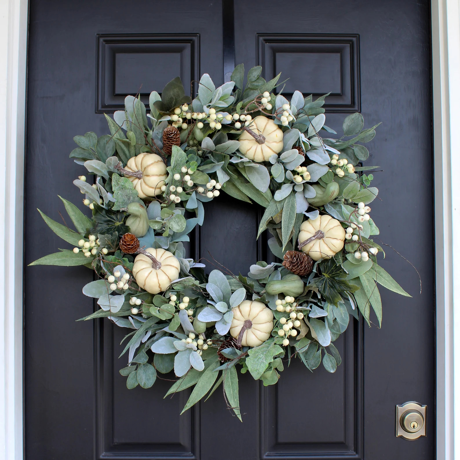 1. Cream Pumpkin & Gourd, Eucalyptus, Lamb’s Ear Fall Harvest Front Door Wreath