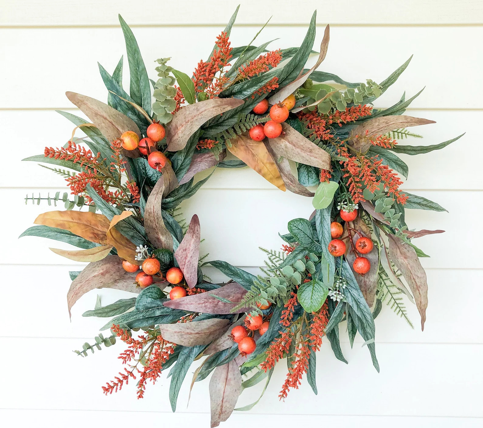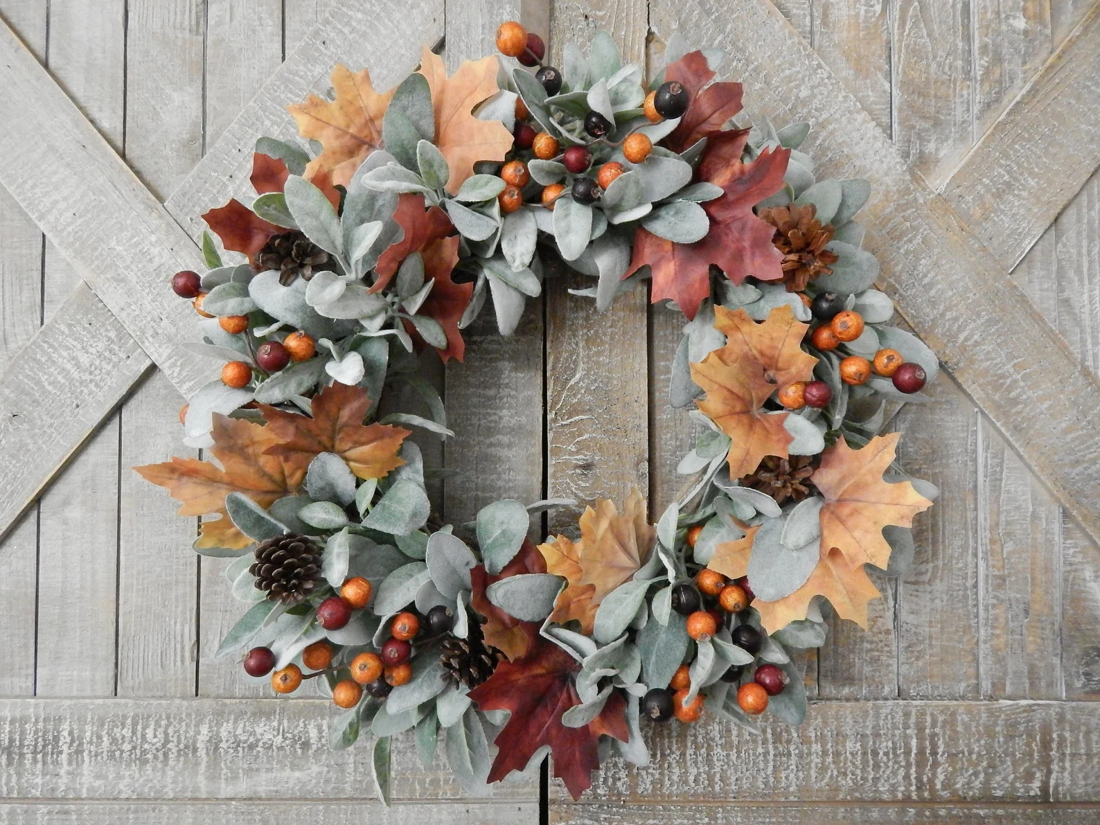 18. Fall Lambs Ear Wreath with Berries and Maple Leaves