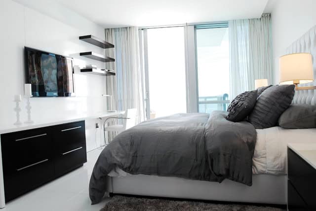The bedroom is a place for rest and relaxation, and its function successfully is completed if it has room for a bed, bedside table and properly lighting. However, there are ways to make a small room visually larger. Put a mirror on the wall or closet – if the mirror extends from floor to ceiling and is set on the surface of an entire wall, it will visually double the size of the bedroom. Allow natural light to enter – it will allow the bedroom daytime look spacious and more comfortable. In the small bedrooms often the headboard of the bed is next to a window. Choose a headboard that will not block the light, as for example the one with the metal frame.