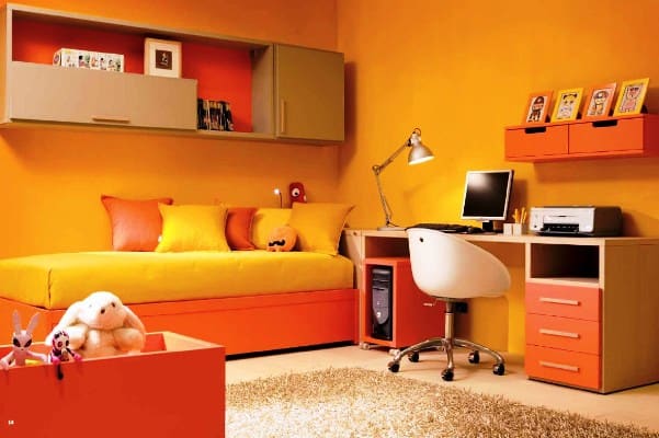 Orange is an exciting and vibrant color, which provides a good alternative for decorating. However, don’t let it dominate too much in the space, and use it in detail and decorative items, combined with neutral tones and simple patterns. This color fits the thematic arrangement of rooms in safari style or sports-themed rooms.
