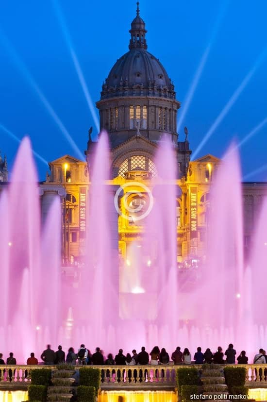 This spectacular, pink illuminated water feature is the Font Magica de Montjuic in Barcelona, Spain.