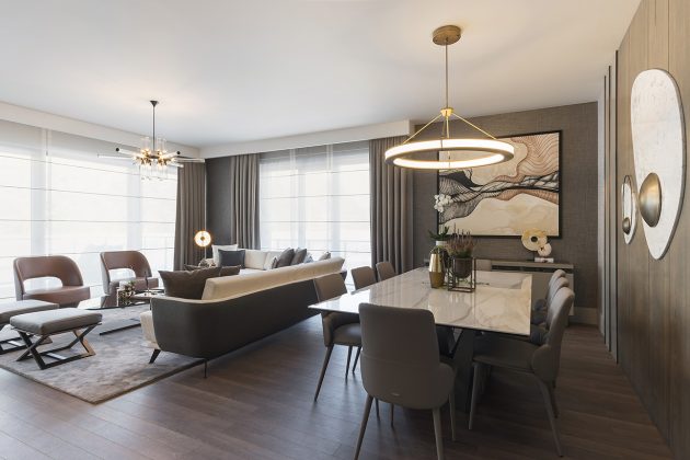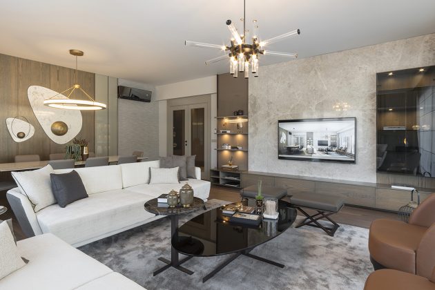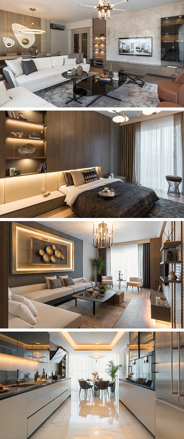 Gonye Proje Tasarim has successfully designed a modern 2,152 square feet flat within the 38. Cadde project in Kayseri, Turkey. They have managed to create the perfect harmony of materials and details by giving priority to the visual design richness along the functions.