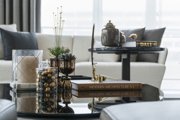 Taking advantage of the natural light entering from both sides, dark-colored fabric wallpapers with textile tissues were used on two walls. With the intention of creating modern and elegant spaces, imported furniture and custom made furniture designs with fine details featuring bronze metal, painted glass, and leather coatings were used in the living room and bedroom.