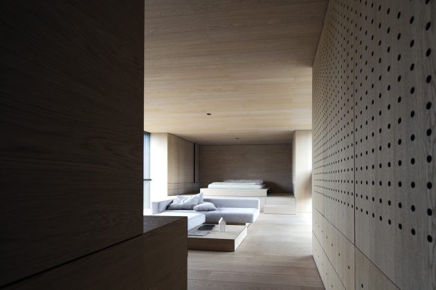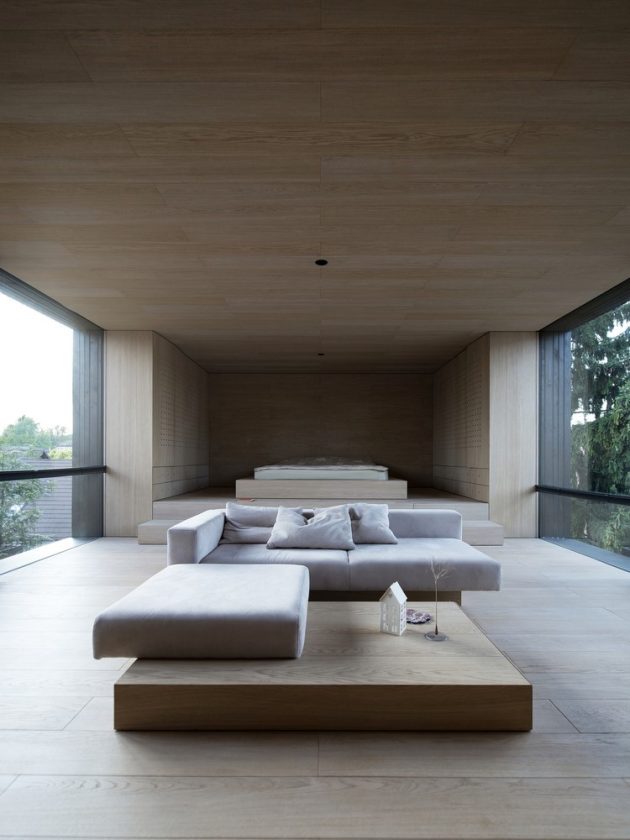 The heart of the house – intersection of volumes and connector of old and new is a staircase attached to a main vertical concrete wall. Inspired by Adolf Loos interiors forms elevated podiums, niches, wardrobes, small sitting areas and is partly extended into small spaces in the existing part of the house creating private living areas on each floor.