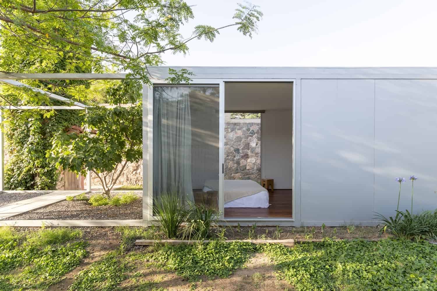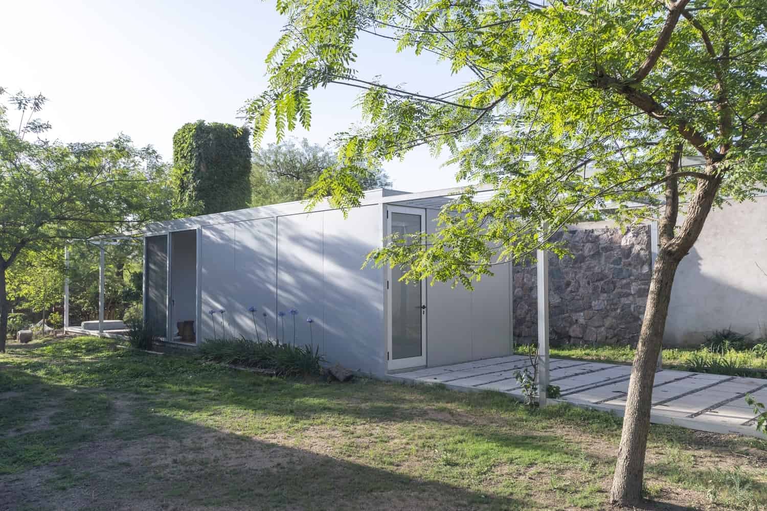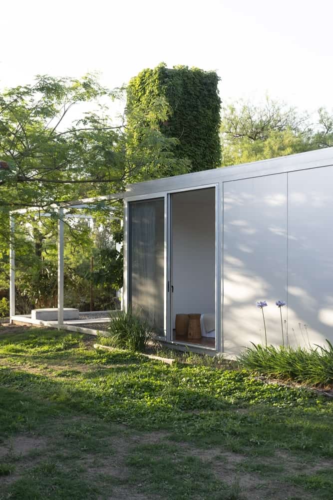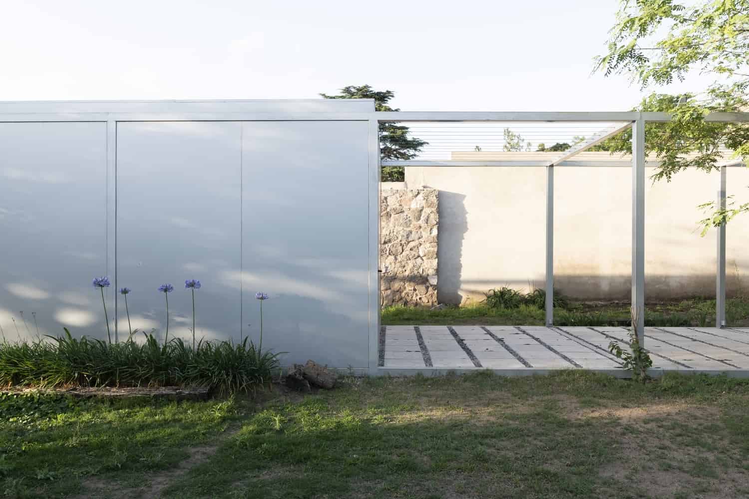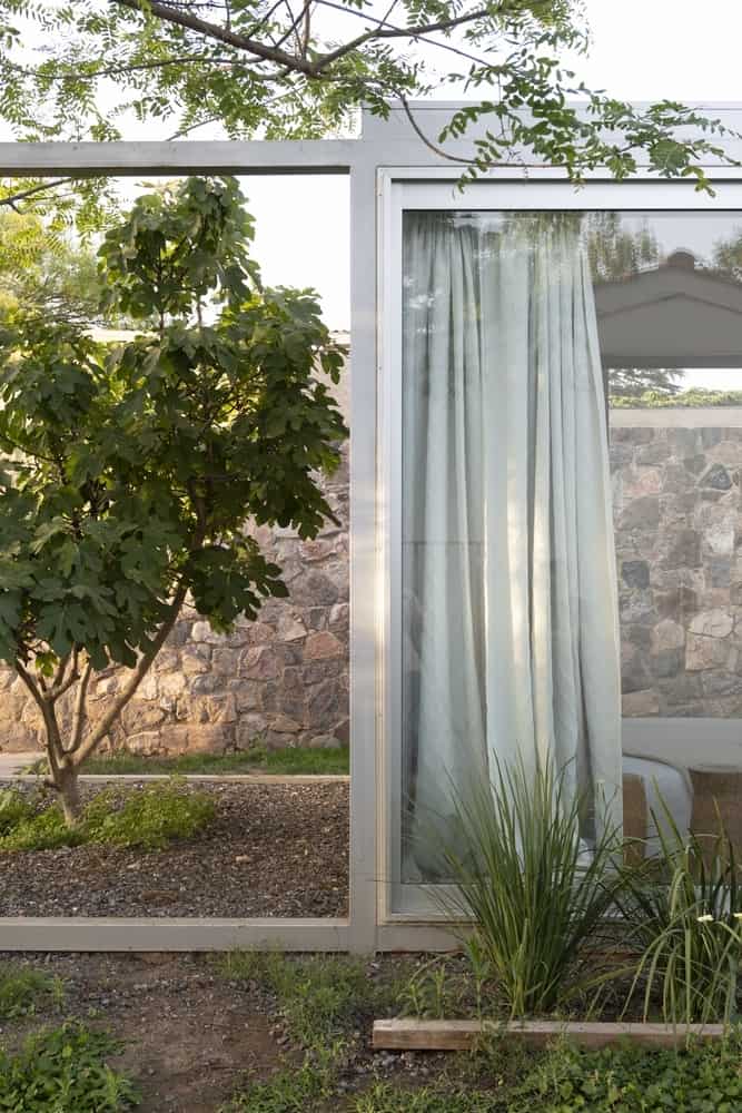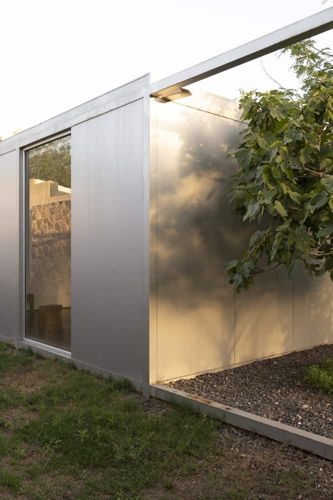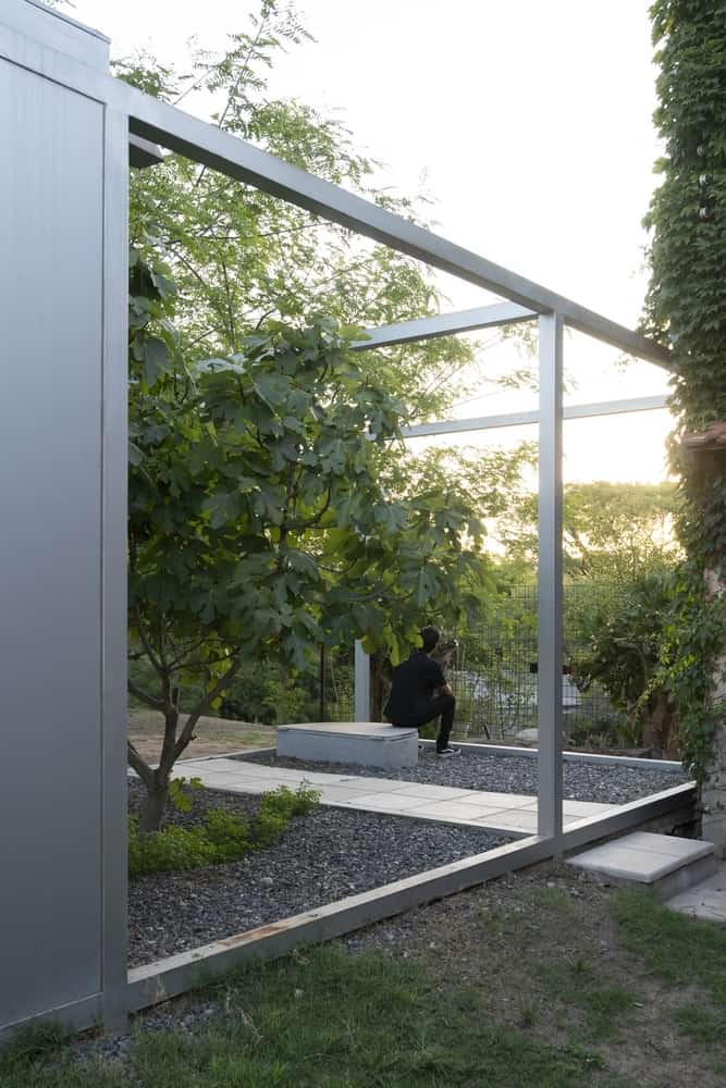 A flat roof extends the linear reading of the pavilion and incorporates water collection to irrigate the fig tree—an understated gesture of ecological integration.