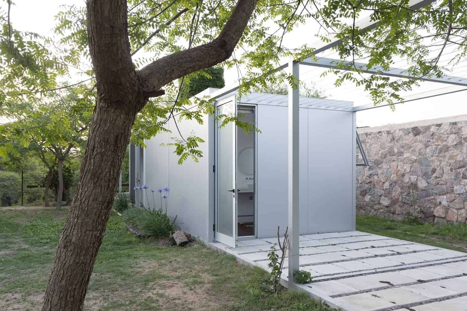 In Between: A connective zone incorporates water infrastructure, access to the tank, an outdoor-use bathroom, and a fig tree integrated into the pavilion, emphasizing the continuity of nature and architecture.