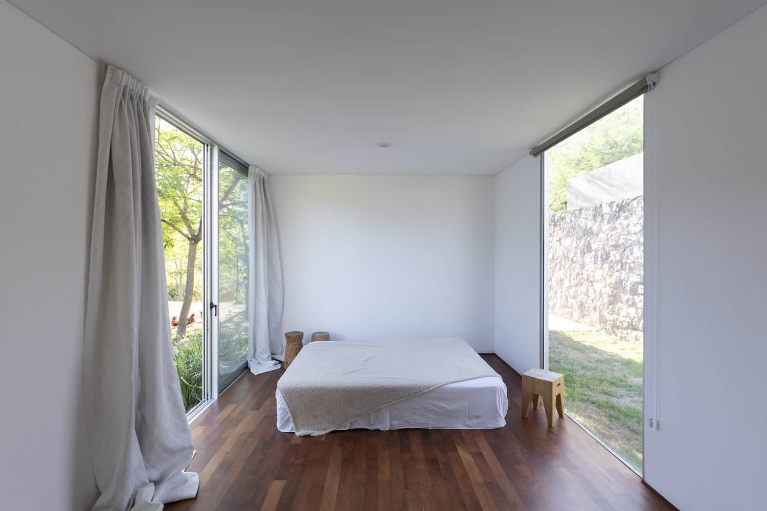 Interior finishes contrast with this reflective exterior: reused carob wood from an old farmhouse brings warmth, tactile richness, and a distinctive aroma. White walls and strategic openings frame views, reinforcing the connection to the surrounding landscape.