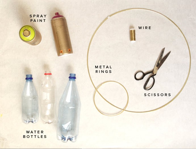 Begin creating an original front door wreath by gathering plastic bottles in various colors to upcycle them into a unique design.