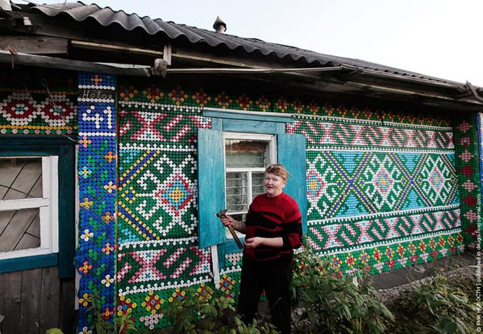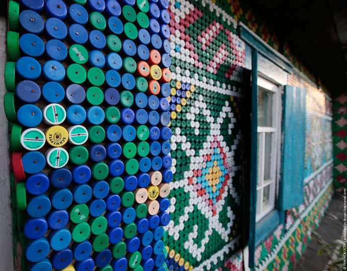 Transform the exterior of your cabin into a captivating masterpiece by crafting a decorative mosaic using an array of plastic bottle caps. This innovative and environmentally conscious design concept promises to infuse your outdoor sanctuary with a burst of vibrant hues and imaginative flair.