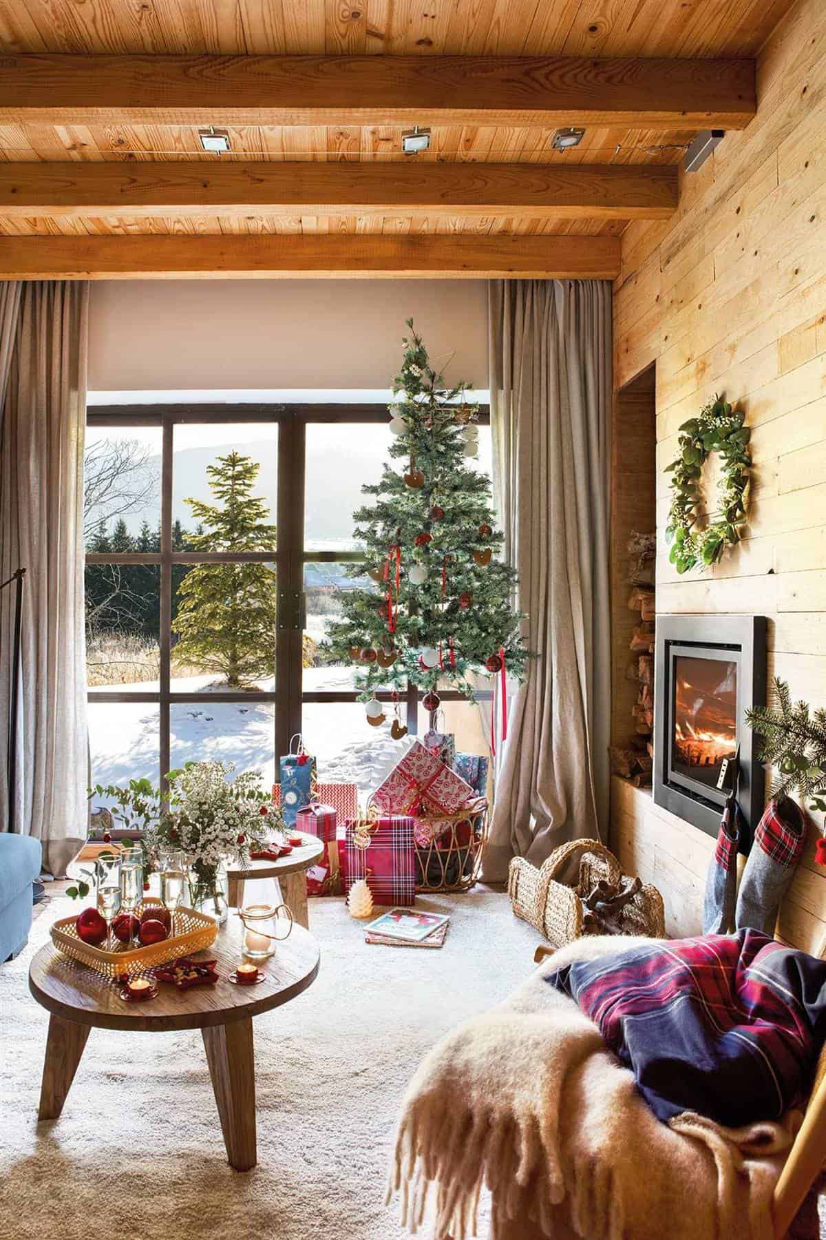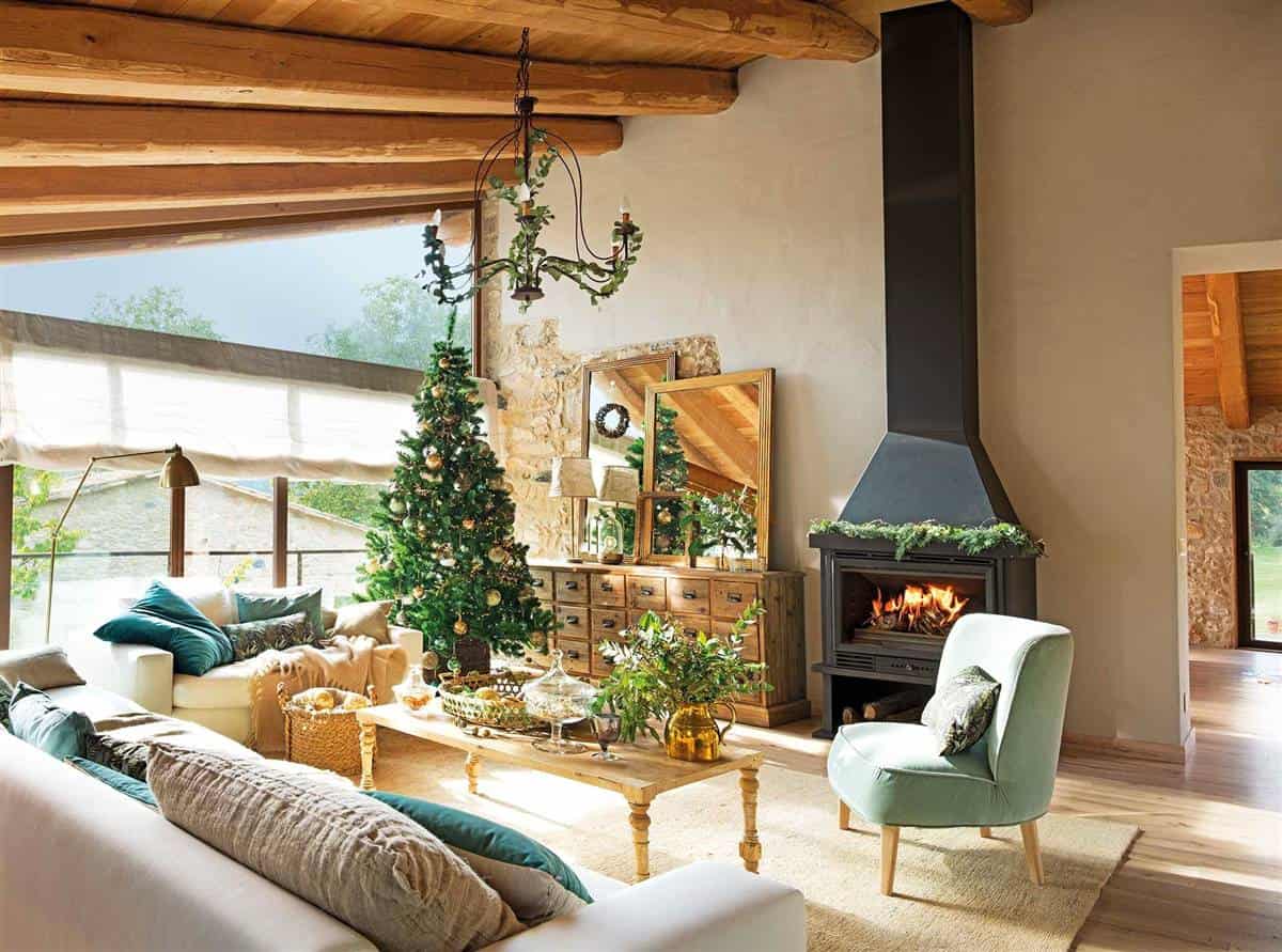 This house used to be two haystacks that for a long time were used as stables and corrals for animals. Until their current owners decided to rehabilitate them and turn them into this comfortable rural house with large windows. Now, they get away whenever they can, Christmas included! To decorate it? Lots of green and touches of gold, which give it that elegant Christmas touch.