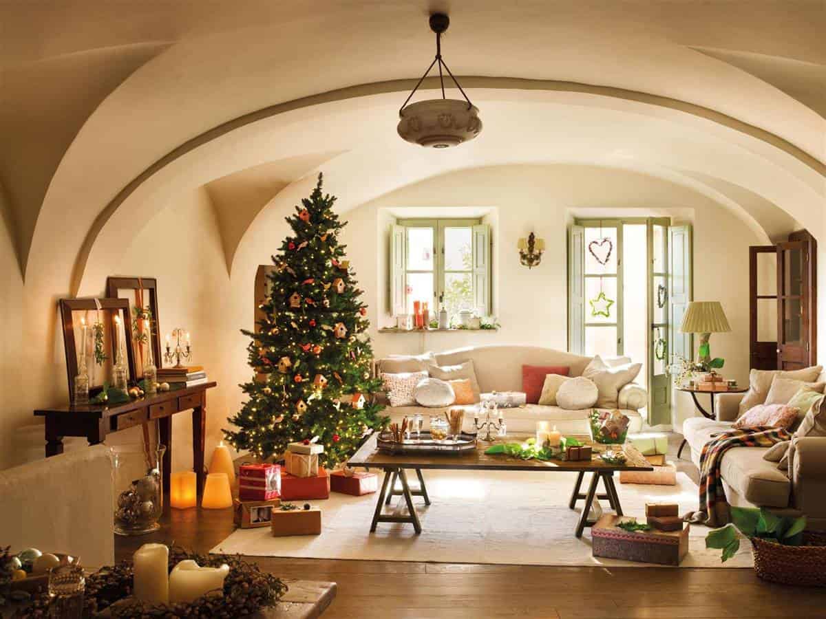 White accents and ornaments with natural motifs give this living room a Nordic touch that garlands of light, candles, and stars complete perfectly.