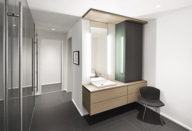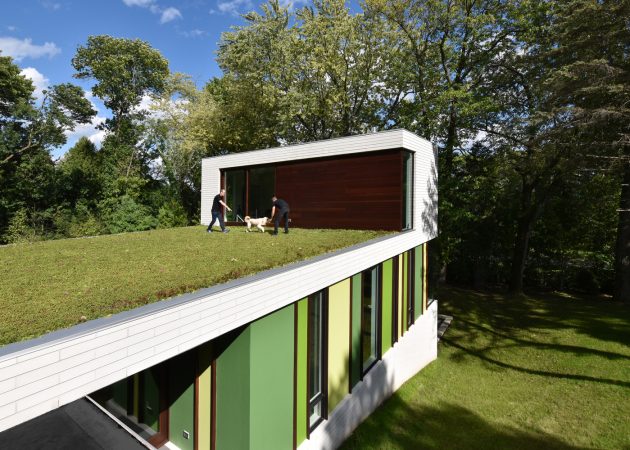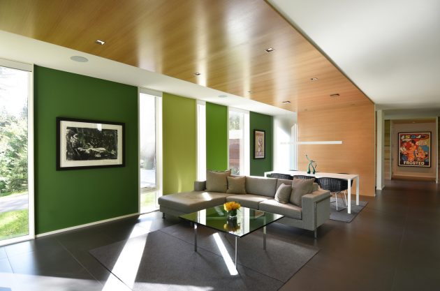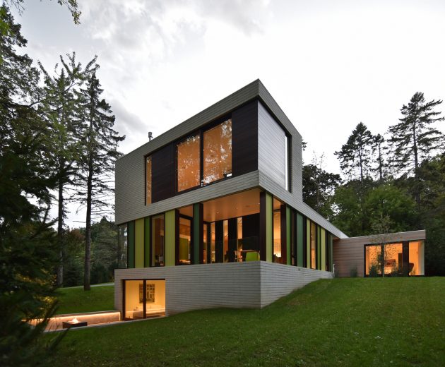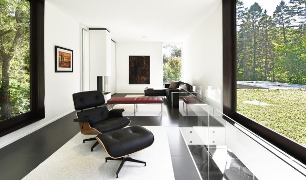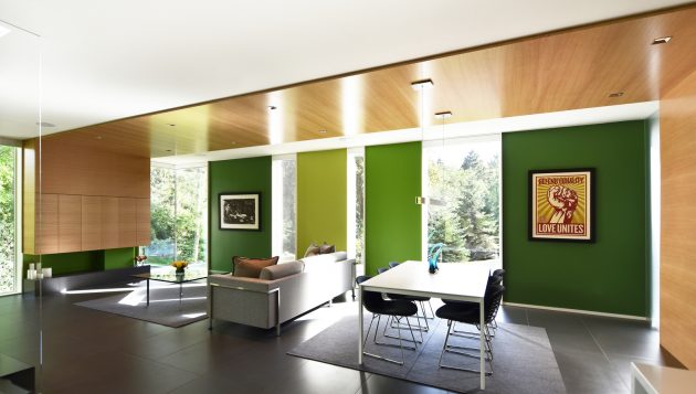 The green tones infuse the interior with the lush vibrancy of Wisconsin’s short summers, acting as a visual counterpoint during the long winters when the windows frame frozen landscapes. The walls extend outside, giving architectural expression to the living hall as a proud piano nobile, suspended within the concrete ribbon.