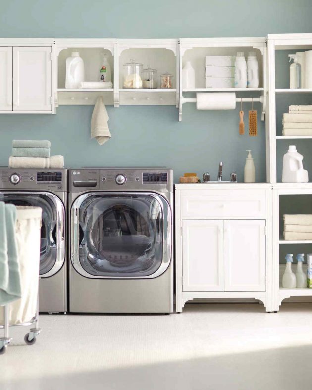Very often – as we wrote above – the washing machine is in the bathroom. It is sometimes the only place in the accommodation that has a water drain. As in the previous case, the advantage of this configuration is to optimize the top and the surroundings of the machine to have a real space dedicated to washing clothes. Here racks are targeted on the walls to be able to arrange the space in a modular way. A shelf serves as a worktop for folding the laundry while above, shelves serve as shelves.