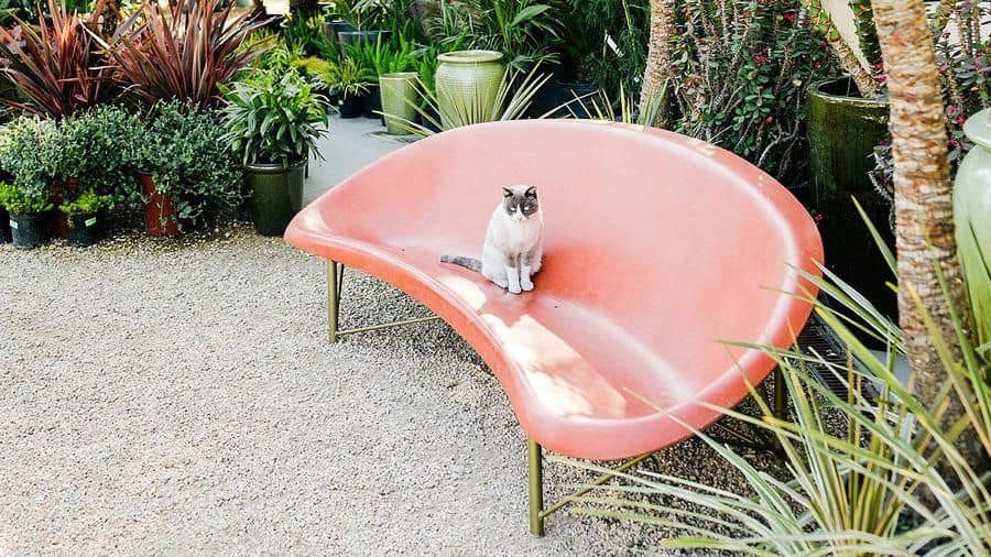 There is a secret to this russet-colored bench you see. And we will reveal it for you! The cast stone material is wired with energy-efficient heating which can provide a pool of warm on a chilly evening. Or just be cranked up to surprise unsuspecting guests like this one on the photo. Unsuspected? Well, we’ll think about that since we love our animals.