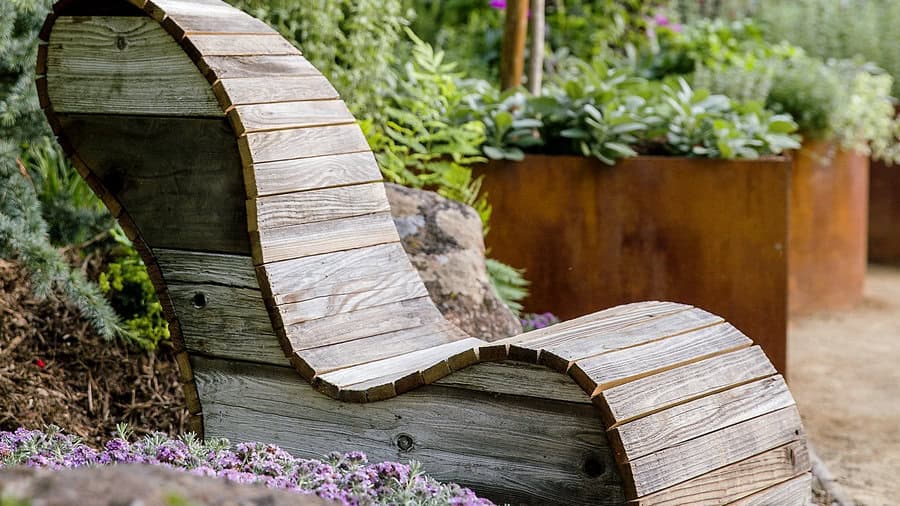 Reclaimed wood can be the perfect material to build a bean-shaped chair like this one. In a woodland garden this chair look right at home with all the ferns and native salvia. It gives a form of graceful, organic curve and definitely created a comfortable backseat.