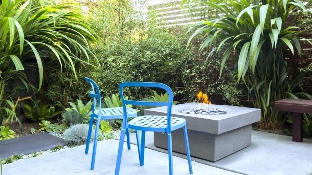 Turning your backyard into a private retreat doesn’t look impossible anymore. You can do it by adding tiers of greenery, like palm grass (Setaria palmifolia) that will provide a different screening and will bring the feeling of the tropics into your garden. And the set of bright blue chairs is just another reason along with the outdoor fireplace to make you stay outside past dusk.