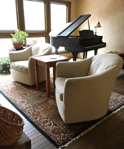 This studio space greets Lynn Purse and her family with ample sunshine and inspiration. The south-facing windows let lots of light stream in as family members read by the fire, challenge each other to a chess match or play the piano. The scene beyond the windows — tall trees and wildlife — continually inspires Purse as she composes music on a piano given to her by her late aunt, who was a concert pianist. “The window on the woods and garden is a year-round spectacle,” she says.