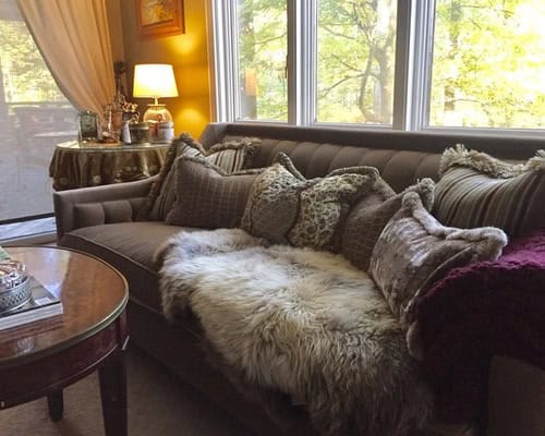 Kimann Schultz likes to retreat to this cozy spot in her home. Compared with the rest of the Indianapolis, Indiana, house, this corner of the master bedroom has a lower ceiling and a smaller scale, she says. For additional coziness, the family used dark paint on the walls, added muslin curtain frames on the doors that lead to the deck and filled the sofa with down pillows, a faux fur coverlet and crocheted afghan.
