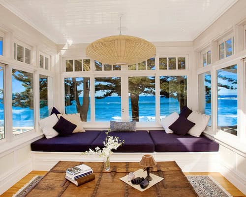 This window seat with large purple cushions is surrounded by windows on three sides, providing beautiful outlooks onto Newport Beach in Sydney.
