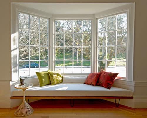 A plywood base with a veneer edge and hairpin legs makes for a cool contemporary window seat designed by Megan Nordin Designs.