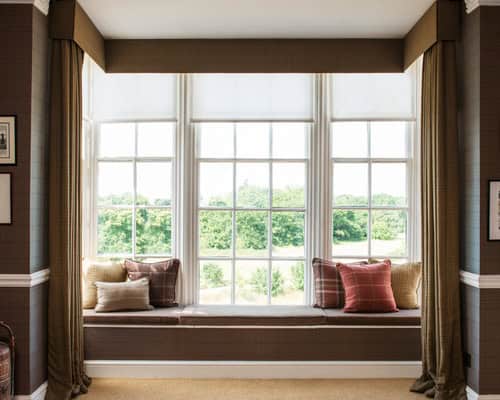 This London window seat features Zoffany velvet cushions and a variety of wool tartan pillows.
