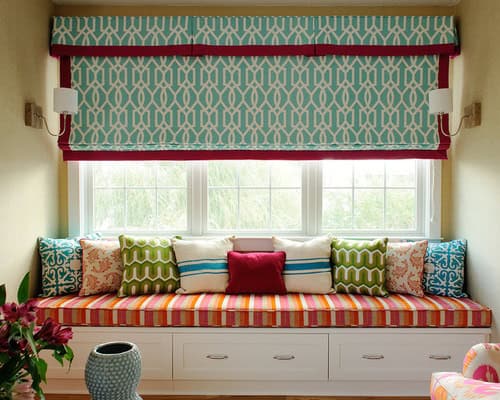 A boldly striped bench cushion teamed with a collection of pillows in all different styles and patterns makes for a festive window seat in Philadelphia.