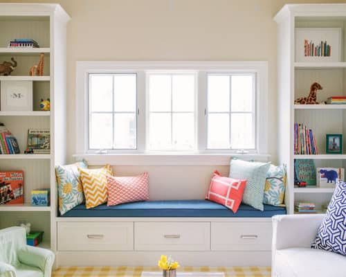 This window bench with cabinets underneath and bookcases at both ends makes for a nice reading spot in Chicago.